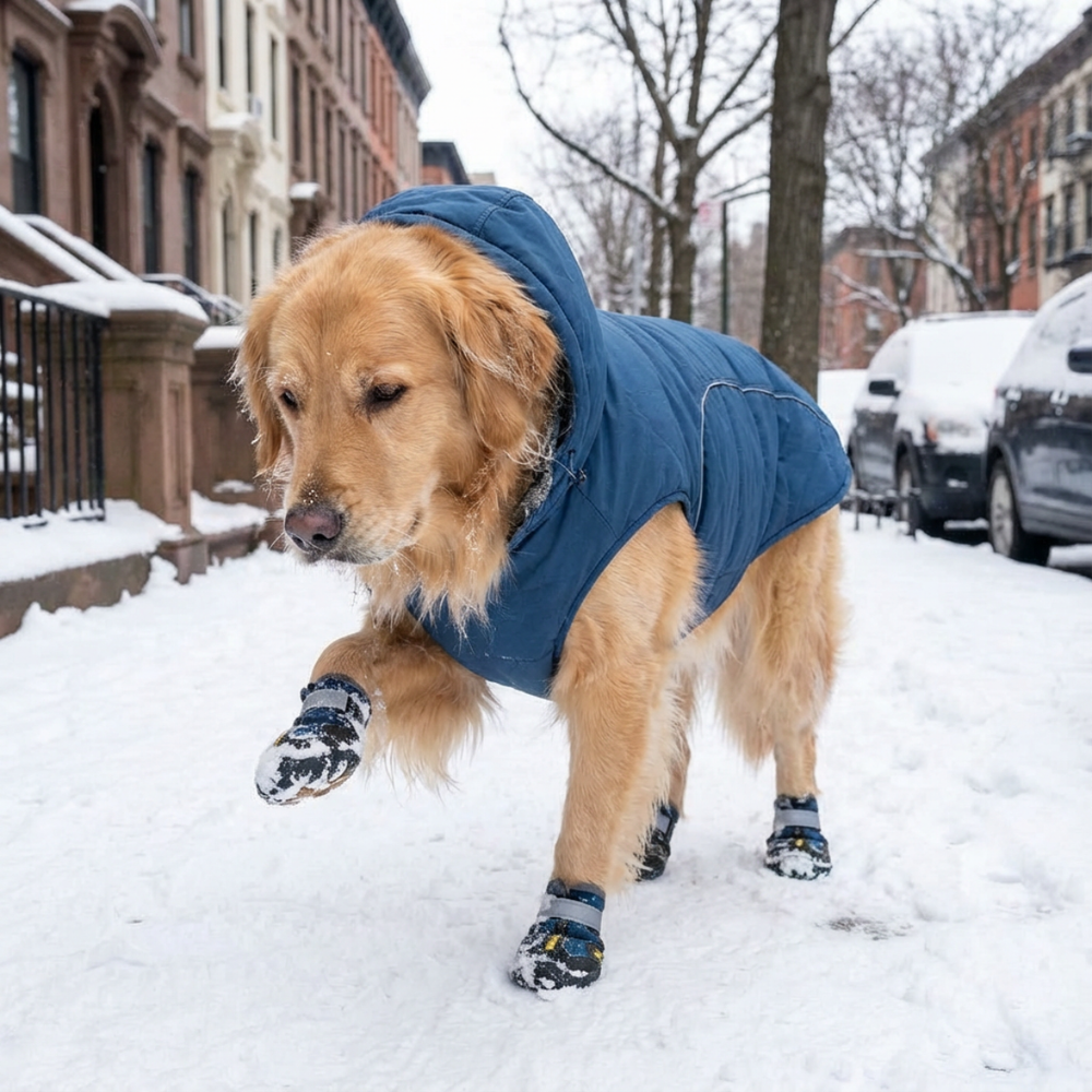 Warm, secure dog boots protect her paws from cold, salt, and slippery ground—so every step feels steady and comfortable, even on icy days.